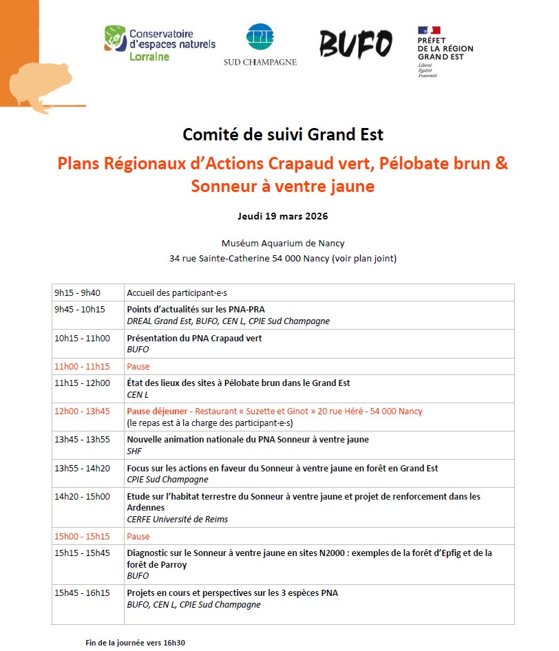 La DREAL Grand Est et les structures animatrices (BUFO, CPIE du Sud Champagne et Conservatoire d’Espaces Naturels de Lorraine) vous convient au traditionnel comité de suivi des plans régionaux d’actions en faveur de trois des amphibiens du Grand Est : Sonneur à ventre jaune, Crapaud vert et Pélobate brun.