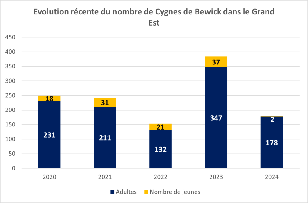 Le nombre de Cygne de Bewick en Champagne dépend grandement des conditions météorologiques. En cas de températures clémentes, les Bewick ont tendances à rester plus au nord comme ce fut le cas en 2022 ou en 2024. Les effectifs de 2020, 2021 et 2023 sont au-dessus de la moyenne. La proportion de jeunes est en revanche une bonne indication du succès reproducteur, très faible en 2024.