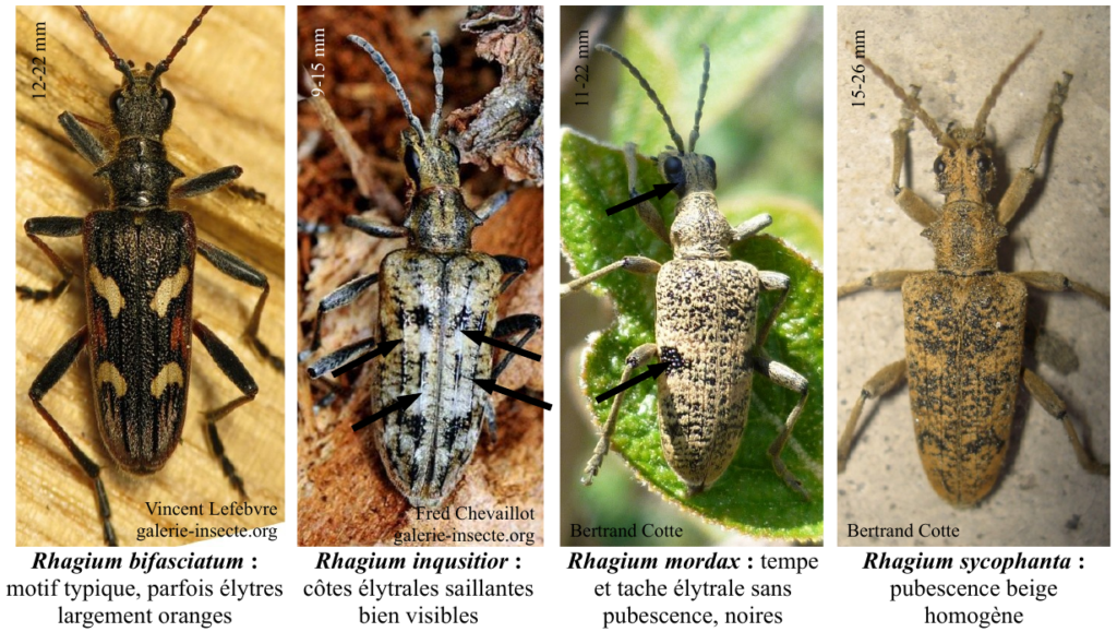 La détermination à l’espèce ne pose pas de difficulté majeure, et l’on pourra se référer à la planche des Lepturinae Rhagiini de l’aide à l’identification des longicornes de Franche-Comté de Bertrand Cotte. Un peu de variation reste possible, et certains motifs plus ou moins effacés peuvent compliquer l’affaire : joindre une photo à son observation reste donc fortement recommandé, et permettra de consolider sainement la base de données et la répartition régionale de ces quatre espèces !