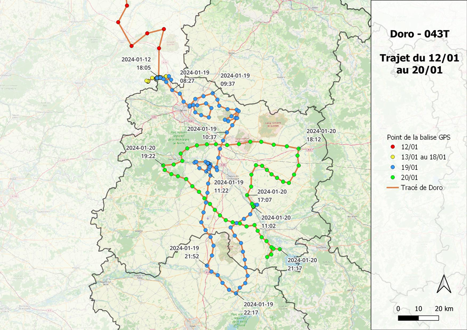 Arrivé en France le 12/01, Doro a stationné 5 jours dans des cultures en bordure de l’Aisne, à la frontière entre le département éponyme et la Marne. Ce n’est qu’alors qu’il se lance dans la traversée de la Marne, en long en large et en travers sur deux jours, avant de finalement rejoindre le lac du Der le 20/01.
