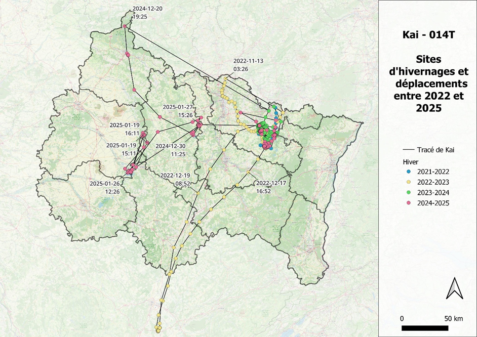Ainsi, en 4 hivers, Kai est toujours venu dans le Grand Est. Il arrive en novembre, voir en décembre, et repart de nos contrées en mars.